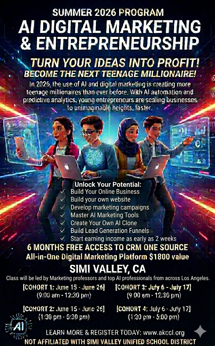 This program gives students real-world, high-income digital skills and walks them step-by-step through launching their own business. All that is needed is a laptop, a phone, and a notebook.